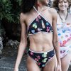 Nyakbakötős bikini felső, dekoratív fehér pántokkal. Hátul csúszkával állíthatós pánttal. A puha, rugalmas ECONYL® anyag gyorsan szárad, kivételesen tartós, és gyengéd a bőrhöz. Egyedileg készült, kézzel festett minták díszítik.