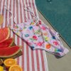 Halter fazonú bikini felső, dekoratív fehér pántokkal. Hátul csúszkával állíthatós pánttal és nyakba kötővel. A puha, rugalmas ECONYL® anyag gyorsan szárad, kivételesen tartós, és gyengéd a bőrhöz. Egyedileg készült, kézzel festett minták díszítik.